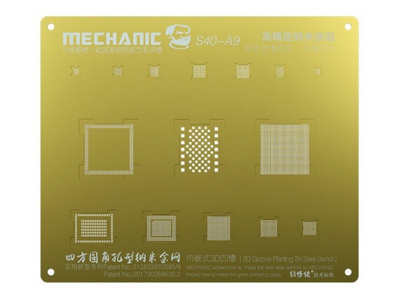 The Mechanic S40 A9 stencil represents technological excellence for professional reballing. Thanks to the innovative 3D Groove design, the A9 chip automatically positions itself in the pre-shaped slots, eliminating any alignment errors and guaranteeing a perfect solder on the first attempt.