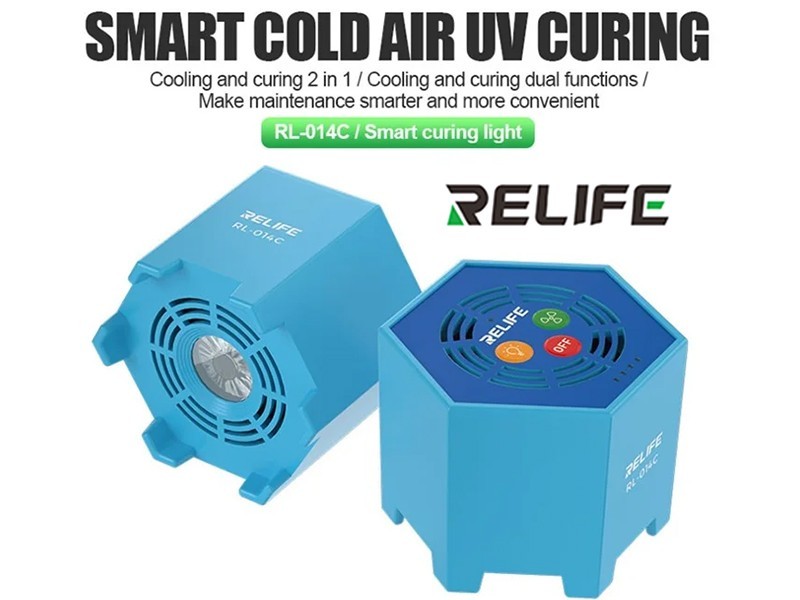Relife RL-014C is a 2-in-1 smart lamp that combines a UV curing lamp and a built-in cooling fan, designed to make repairing electronics motherboards easier.