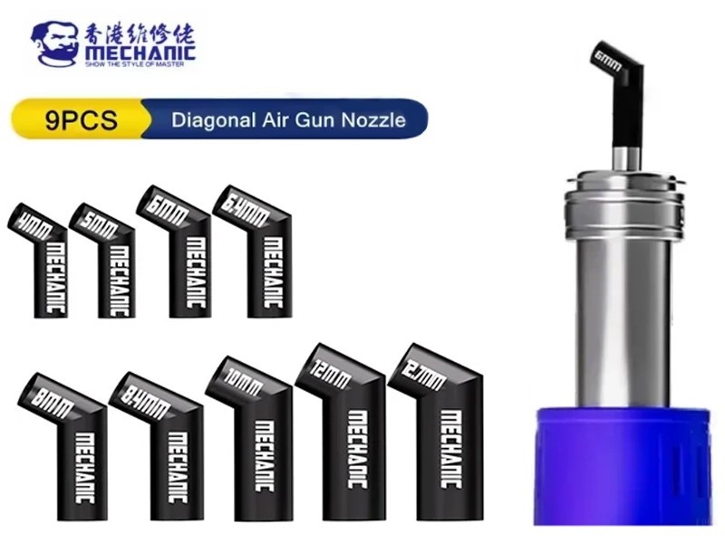 The Mechanic 9-in-1 Nozzle Set is the ideal accessory for micro-soldering professionals. Thanks to their exclusive angled (diagonal) design, these nozzles solve the problem of obstructed views during repairs under a microscope, allowing you to direct airflow with surgical precision without tilting the entire station handle.